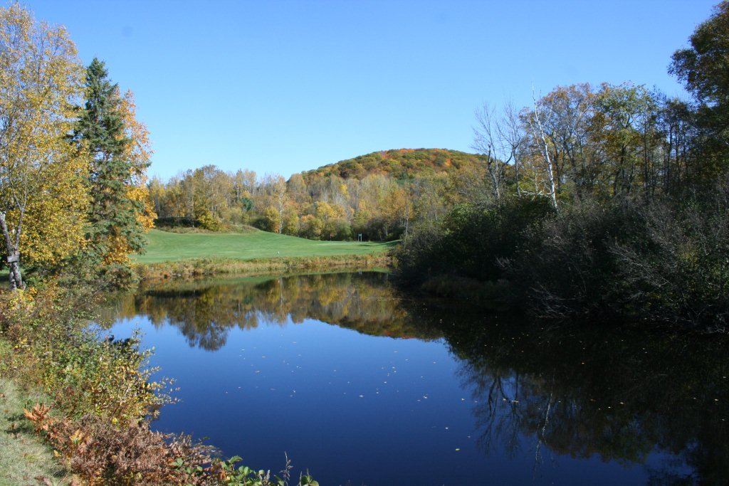 This is the Club's signature hole, with an iron shot or 5 wood over the Magnetawan River to a small green, shaped like an upside down dish. If you don't lose your ball in the water, you'll be glad with a bogey! The drop area is 40 yards to the green.